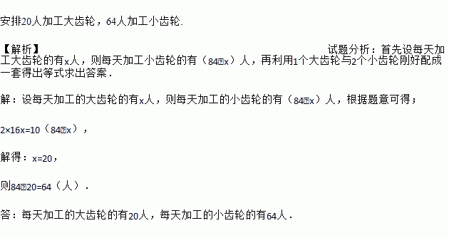 某机械厂加工车间有84名工人,平均每人每天加工大齿轮16个或者小齿轮10个,已知1个大齿轮与2个小齿轮刚好配成一套,问分别安排多少名工人加工大,小齿轮,才能使每天加工的大小齿轮刚好配套?