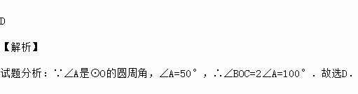 D 【解析】 试题分析:∵∠A是⊙O的圆周角,∠A=50°,∴∠BOC=2∠A=100°.故选D.