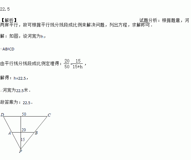 如图,一条河的两岸有一段是平行的,在河的南岸边每隔5米有一棵树,在北岸边每隔50米有一根电线杆,小丽站在离岸边15米的点P处看北岸,发现北岸相邻的两根电线杆恰好被南岸的两棵树遮住,并且这两棵树之间还有三棵树,则河的宽度为_______米.