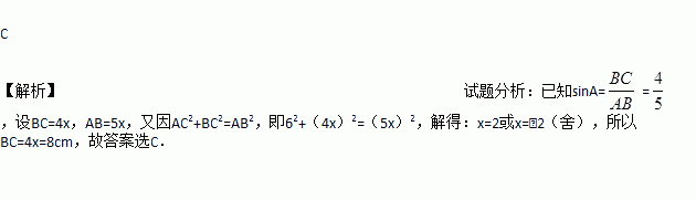 如图,在Rt△ABC中,∠C=90°,sinA=,AC=6cm,则BC的长度为( )