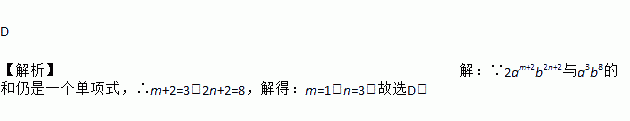 D 【解析】【解析】 ∵2am+2b2n+2与a3b8的和仍是一个单项式,∴m+2=3,2n+2=8,解得:m=1,n=3.故选D.