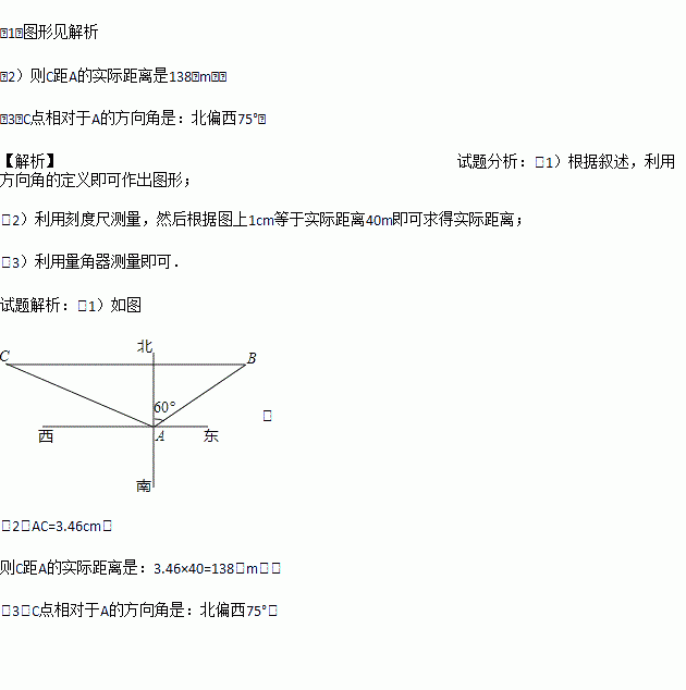 小明从A点出发向北偏东60°方向走了80m米到达B地,从B地他又向西走了160m到达C地.