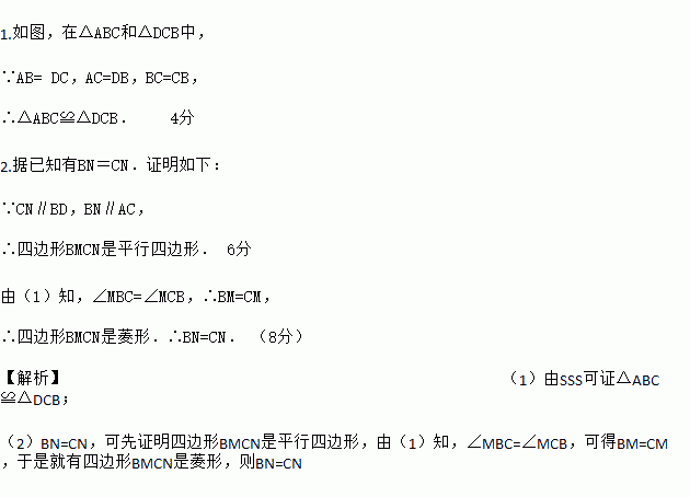 2.过点C作CN∥BD,过点B作BN∥AC,CN与BN交于点N,试判断线段BN与CN的数量关系,并证明你的结论.