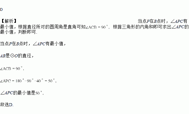 如图,AB是⊙O的直径,点C在⊙O上,P是线段OB上的任意一点.若∠CAB=40°,则∠APC的大小不可能为( )