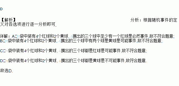 袋中装有4个红球和2个黄球,这些球的形状、大小、质地完全相同.在看不到球的条件下,随机地从袋子中摸出三个球,下列事件是不可能事件的是( )