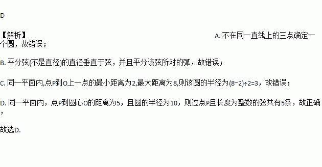 D. 同一平面内,点P到圆心O的距离为5,且圆的半径为10,则过点P且长度为整数的弦共有5条