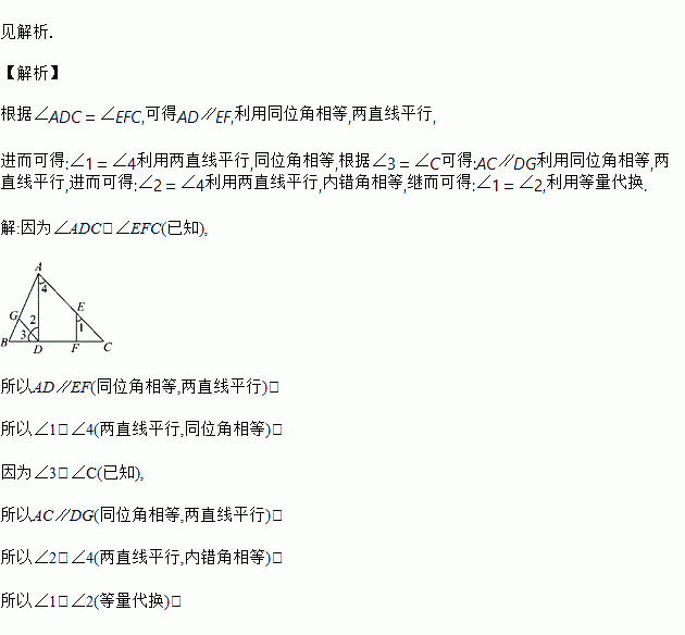 如图,已知∠ADC=∠EFC,∠3=∠C,可推得∠1=∠2.理由如下: