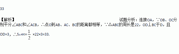 如图所示,已知△ABC的周长是22,BO,CO分别平分∠ABC和∠ACB,OD⊥BC于D,且OD=3,则△ABC的面积是______ 。