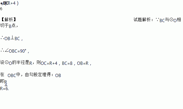 如图,AB是⊙O的直径,O是圆心,BC与⊙O相切于点B,CD交⊙O于点D,且BC=8,CD=4,那么⊙O的半径是______。