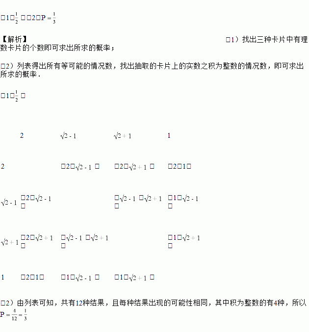 (2)将卡片揺匀后先随机抽出一张,再从剩下的卡片中随机抽出一张,然后将抽取的两张卡片上的实数相乘,请你用列表法或树状图(树形图)法,求抽取的两张卡片上的实数之积为整数的概率。