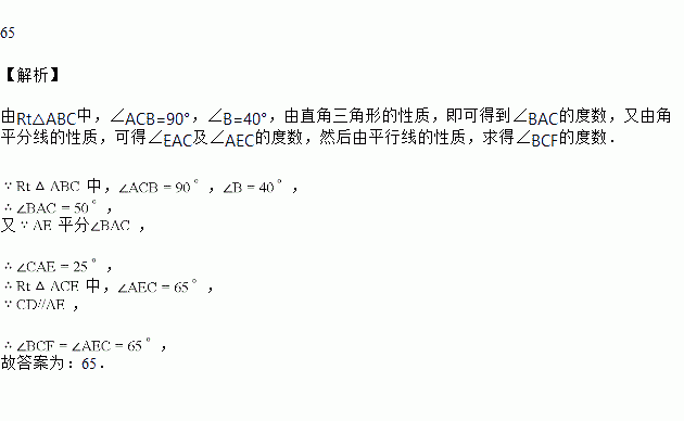 如图,Rt△ABC中,∠ACB=90°,过点C的直线DF与∠BAC的平分线AE平行,若∠B=40°,则∠BCF=__________度.