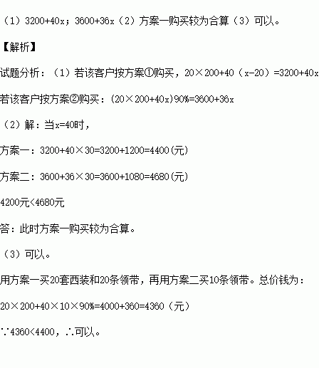 某服装厂生产一种西装和领带,西装每套定价200元,领带每条定价40元。厂方在开展促销活动期间,向客户提供两种优惠方案: