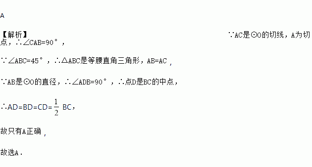 如图AB是⊙O的直径,AC是⊙O的切线,A为切点,连结BC交圆0于点D,连结AD,若∠ABC=45