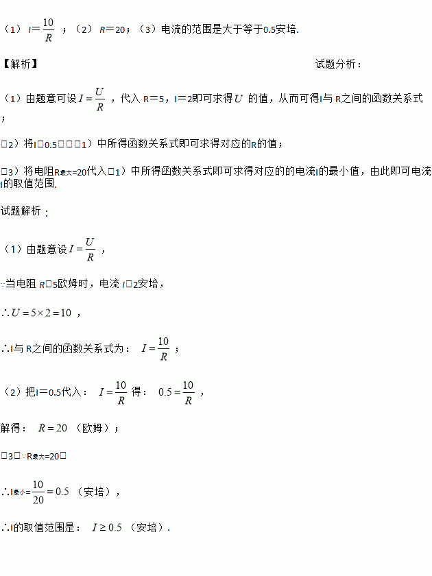 (1) I= ;(2) R=20;(3)电流的范围是大于等于0.5安培. 【解析】试题分析: (1)由题意可设,代入 R=5,I=2即可求得的值,从而可得I与 R之间的函数关系式; (2)将I=0.5代入(1)中所得函数关系式即可求得对应的R的值; (3)将电阻R最大=20代入(1)中所得函数关系式即可求得对应的的电流I的最小值,由此即可电流I的取值范围. 试题解析:...