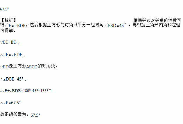 如图,点E在正方形ABCD的边BC的延长线上,如果BE=BD,那么∠E的度数为________.