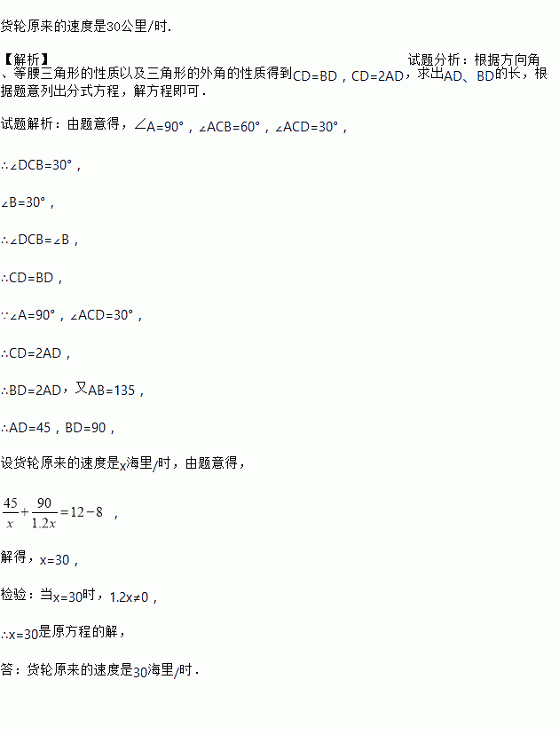 ÈçͼËùʾ£¬¸Û¿ÚAλÓÚµÆËþCµÄÕýÄÏ·½Ïò£¬¸Û¿ÚBλÓÚµÆËþCµÄÄÏÆ«¶«60¡ã·½Ïò£¬ÇÒ¸Û¿ÚBÔÚ¸Û¿ÚAµÄÕý¶«·½ÏòµÄ135¹«Àï´¦.Ò»ËÒ»õÂÖÔÚÉÏÎç8ʱ´Ó¸Û¿ÚA³ö·¢£¬ÔÈËÙÏò¸Û¿ÚBº½ÐÐ.µ±º½Ðе½Î»ÓÚµÆËþCµÄÄÏÆ«¶«30¡ã·½ÏòµÄD´¦Ê±£¬½Óµ½¹«Ë¾ÒªÇóÌáǰ½»»õµÄ֪ͨ£¬ÓÚÊÇÌáËÙµ½ÔÀ´ËٶȵÄ1.2±¶£¬ÓÚÉÏÎç12ʱ׼ʱµ½´ï¸Û¿ÚB£¬Ë³ÀûÍê³É½»»õ.Çó»õÂÖÔÀ´µÄËÙ¶ÈÊǶàÉÙ£¿
