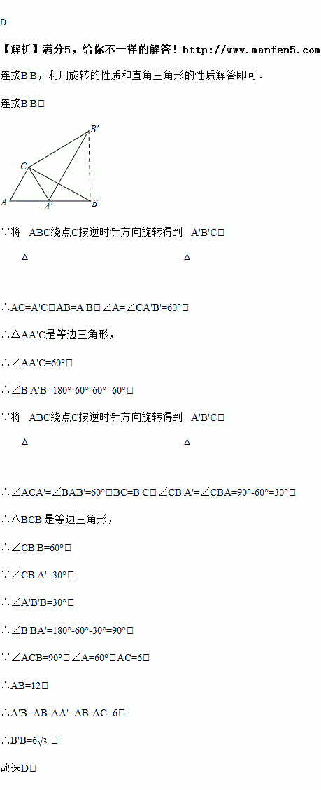 如图,在Rt△ABC中,∠ACB=90°,∠A=60°,AC=6,将△ABC绕点C按逆时针方向旋转得到△A'B'C',此时点A'恰好在AB边上,则点B'与点B之间的距离为( )