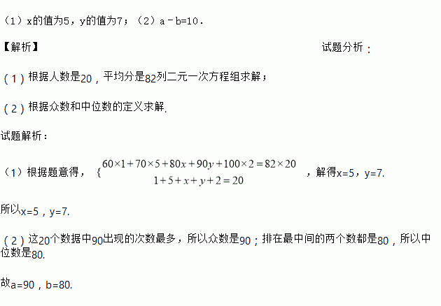 (1)若这20名学生成绩的平均分数为82分,求x和y的值.