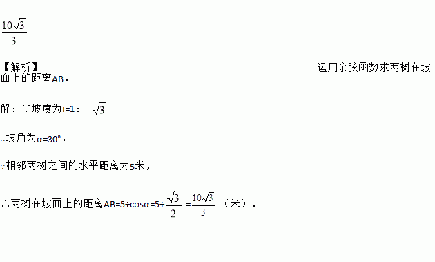 如图,某村准备在坡度为i =1: 的斜坡上栽树,要求相邻两棵树之间的水平距离为5米,则这两棵树在坡面上的距离AB为____________米.(结果保留根号)