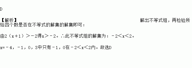 D 【解析】解出不等式组,再检验所给四个数是否在不等式的解集的解集即可: 由2(x+1)>-2得x>﹣2。∴此不等式组的解集为:﹣2<x<2。 x=﹣4,﹣1,0,3中只有﹣1,0在﹣2<x<2内。故选D