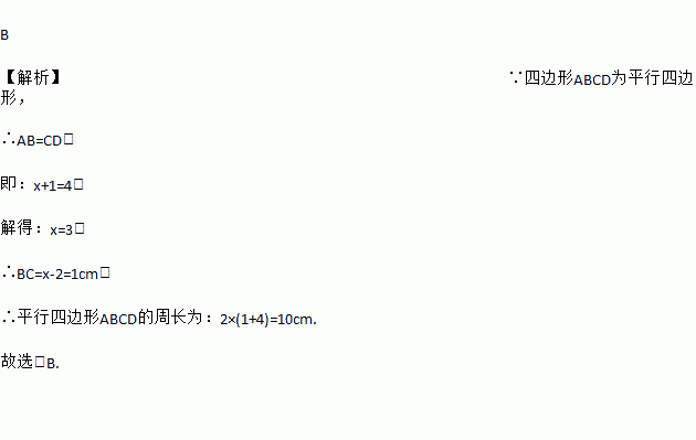 B 【解析】∵四边形ABCD为平行四边形, ∴AB=CD, 即:x+1=4, 解得:x=3, ∴BC=x-2=1cm, ∴平行四边形ABCD的周长为:2×(1+4)=10cm. 故选:B.