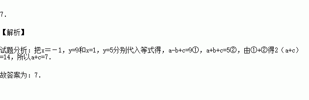 已知等式y=ax2+bx+c,当x=-1时,y=9;当x=1时,y=5,则a+c的值为 .
