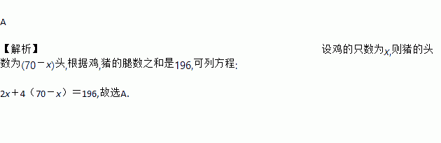 A 【解析】设鸡的只数为x,则猪的头数为(70-x)头,根据鸡,猪的腿数之和是196,可列方程: 2x+4(70-x)=196,故选A.