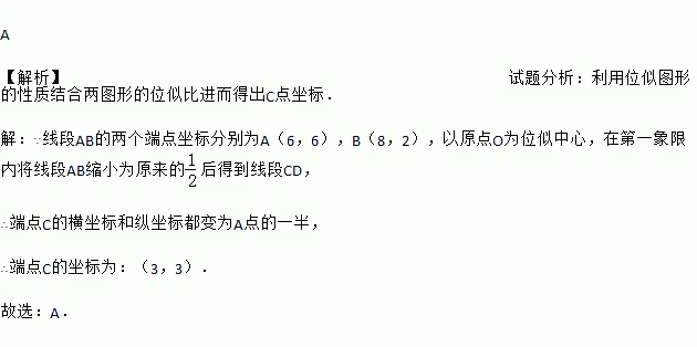 如图,线段AB两个端点的坐标分别为A(6,6),B(8,2),以原点O为位似中心,在第一象限内将线段AB缩小为原来的
