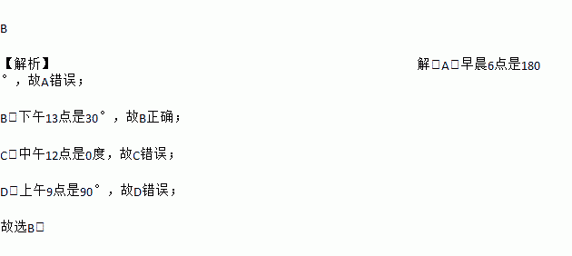 B 【解析】解:A、早晨6点是180°,故A错误; B、下午13点是30°,故B正确; C、中午12点是0度,故C错误; D、上午9点是90°,故D错误; 故选B.