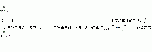 某种商品,甲商场每10元可买x件,乙商场每10元可以买同商品(x+1)件,则每件该商品乙商场比甲商场便宜_________ 元(用x的代数式表示).