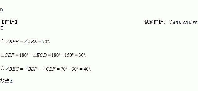 如图,直线AB∥CD∥EF,且∠ABE=70°,∠ECD=150°,则∠BEC=( )