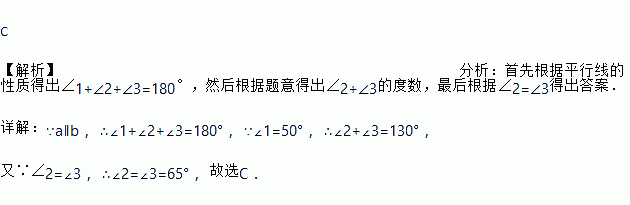 如图,直线 a∥b ,∠1 = 50°, ∠2=∠3 ,则 ∠2的度数是 ( )
