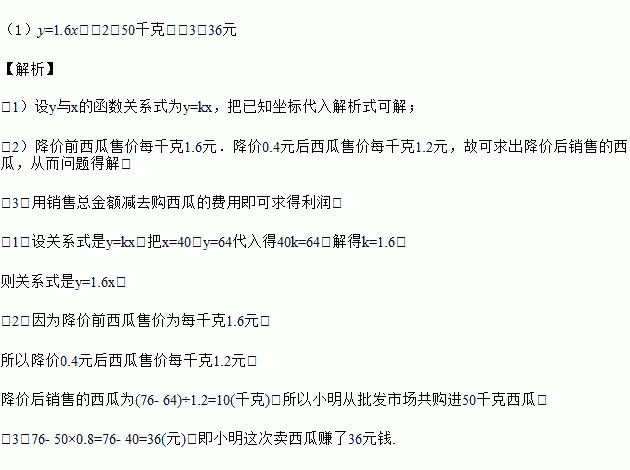小明在暑期社会实践活动中,以每千克0.8元的价格从批发市场购进若干千克西瓜到市场上去销售,在销售了40千克西瓜之后,余下的每千克降价0.4元,全部售完.销售金额与售出西瓜的千克数之间的关系如图所示.请你根据图象提供的信息完成以下问题:
