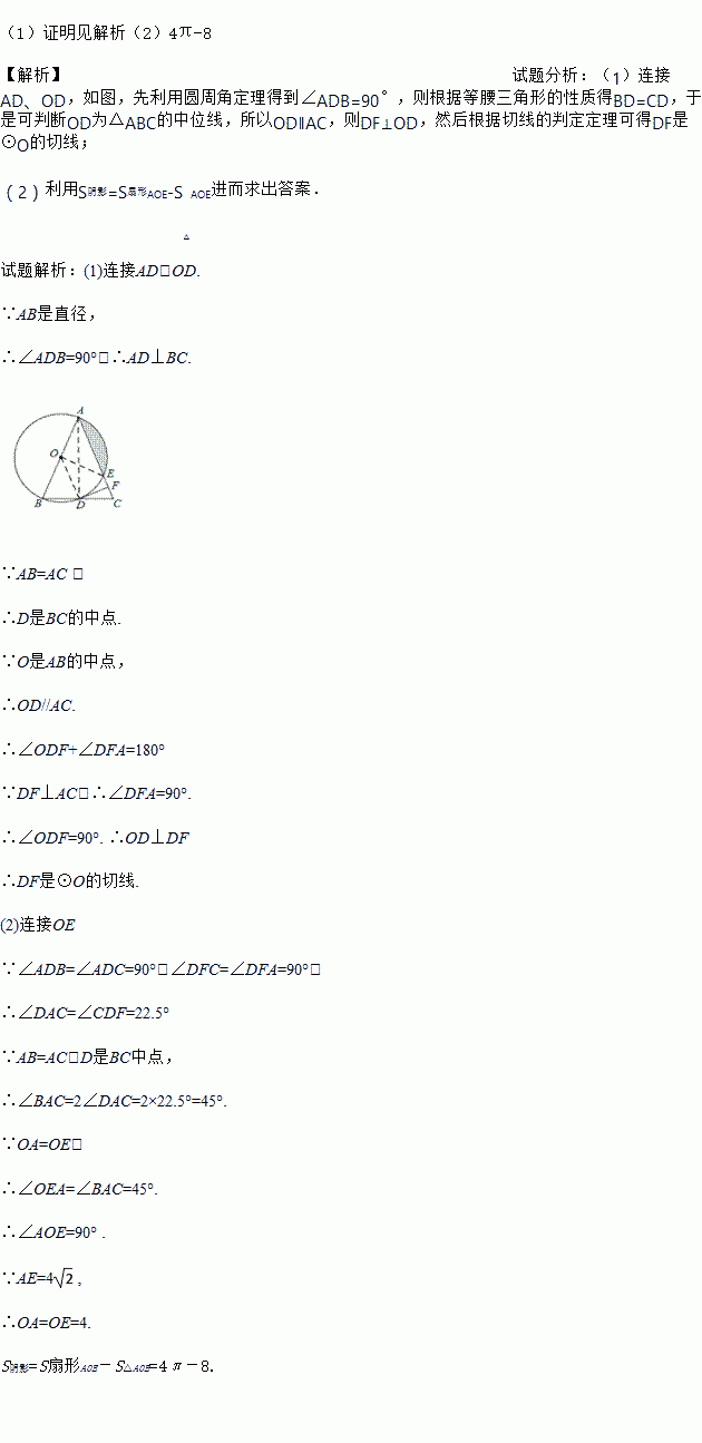 (1)证明见解析(2)4π-8 【解析】试题分析:(1)连接AD、OD,如图,先利用圆周角定理得到∠ADB=90°,则根据等腰三角形的性质得BD=CD,于是可判断OD为△ABC的中位线,所以OD∥AC,则DF⊥OD,然后根据切线的判定定理可得DF是⊙O的切线; (2)利用S阴影=S扇形AOE-S△AOE进而求出答案. 试题解析:(1)连接AD,OD. ∵AB是直径, ...