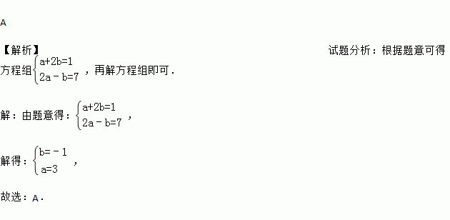 为确保信息安全,信息需加密传输,发送方将明文加密后传输给接收方,接收方收到密文后解密还原为明文,已知某种加密规则为,明文a,b对应的密文为a+2b,2a-b,例如:明文1,2对应的密文是5,0,当接收方收到的密文是1,7时,解密得到的明文是( )