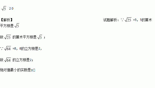 的算术平方根是____, 的立方根是______,绝对值最小的实数是______.
