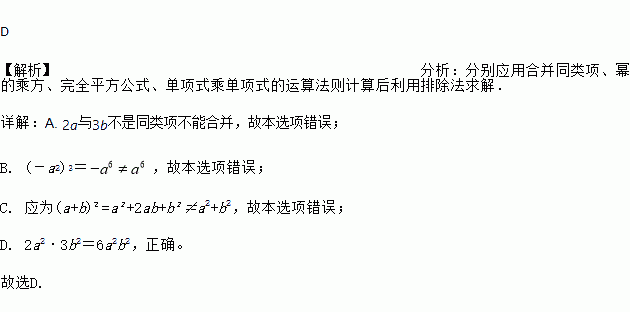 A. 2a+3b=5ab B. (-a2)3=a6 C. (a+b)2=a2+b2 D. 2a2·3b2=6a2b2