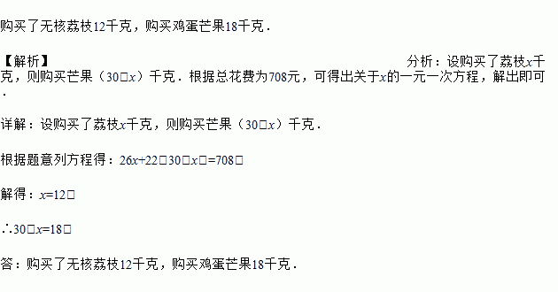 春节期间,某超市出售的荔枝和芒果,单价分别为每千克26元和22元,李叔叔购买这两种水果共30千克,共花了708元,请问李叔叔购买这两种水果各多少千克?