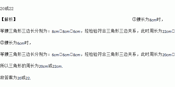 20或22 【解析】①腰长为8cm时, 等腰三角形三边长分别为:8cm、8cm、6cm,经检验符合三角形三边关系,此时周长为22cm; ②腰长为6cm时, 等腰三角形三边长分别为:6cm、6cm、8cm,经检验符合三角形三边关系,此时周长为20cm; 所以三角形的周长为20cm或22cm. 故答案为20或22.