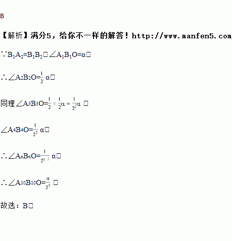 如图,在射线OA,OB上分别截取OA1=OB1,连接A1B1,在B1A1,B1B上分别截取B1A2=B1B2,连接A2B2,…按此规律作下去,若∠A1B1O=α,则∠A10B10O=( )