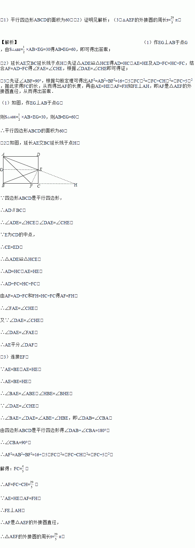 如图,在平行四边形ABCD中,点E是CD的中点,点F是BC边上的点,AF=AD+FC,平行四边形ABCD的面积为S,由A、E、F三点确定的圆的周长为t.