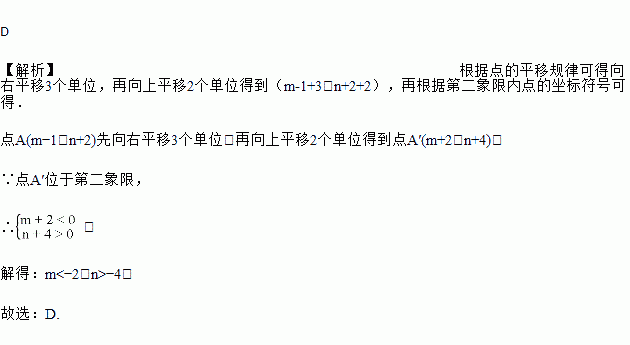 在平面直角坐标系中,将点A( m-1,n+2 )先向右平移3个单位,再向上平移2个单位,得到点A',若点A'位于第二象限,则m,n的取值范围分别是 ( )