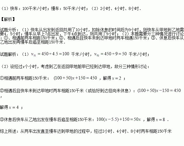 甲、乙两地相距450千米,一辆快车和一辆慢车上午7点分别从甲、乙两地以不变的速度同时出发开往乙地和甲地,快车到达乙地后休息一个小时按原速返回,快车返回甲地时已是下午5点,慢车在快车前一个小时到达甲地.试根据以上信息解答以下问题: