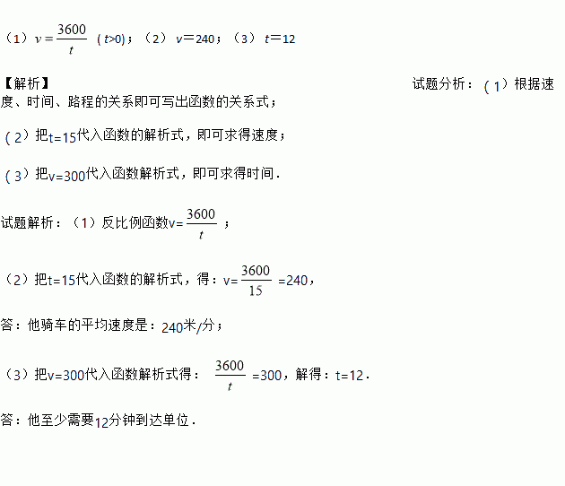 (1) ( t>0);(2) v=240;(3) t=12 【解析】试题分析:(1)根据速度、时间、路程的关系即可写出函数的关系式; (2)把t=15代入函数的解析式,即可求得速度; (3)把v=300代入函数解析式,即可求得时间. 试题解析:(1)反比例函数v=; (2)把t=15代入函数的解析式,得:v==240, 答:他骑车的平均速度是:240米/分; ...