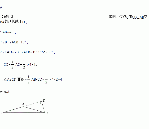 A 【解析】如图,过点C作CD⊥AB交BA的延长线于D, ∵AB=AC, ∴∠B=∠ACB=15°, ∴∠CAD=∠B+∠ACB=15°+15°=30°, ∴CD=AC=×4=2, ∴△ABC的面积=AB•CD=×4×2=4, 故选A.