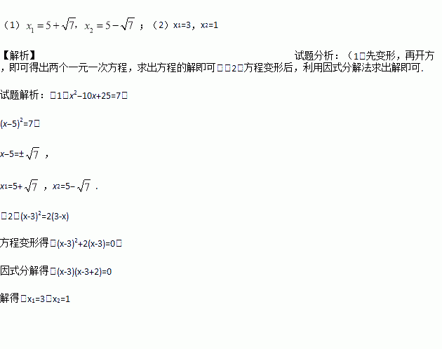 解方程:(1);(2)(x-3)2=2(3-x)