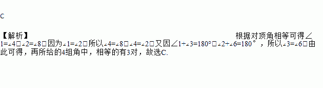 如图所示,若∠1=∠2,在①∠3和∠2;②∠4和∠2;③∠3和∠6;④∠4和∠8中相等的有( )