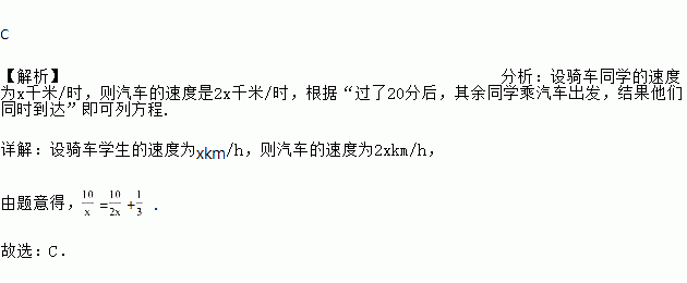 九年级学生去距学校10km的博物馆参观,一部分学生骑自行车先走,过了20min后,其余学生乘汽车出发,结果他们同时到达.已知汽车的速度是骑车学生速度的2倍,求骑车学生的速度.设骑车学生的速度为xkm/h,则所列方程正确的是( )