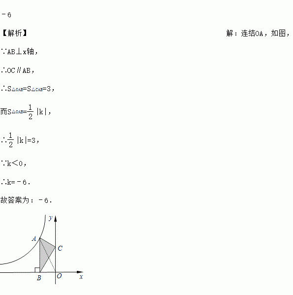 如图,点A是反比例函数y=的图象上的一点,过点A作AB⊥x轴,垂足为B,点C为y轴上的一点,连接AC、BC,若△ABC的面积为3,则k的值是 .