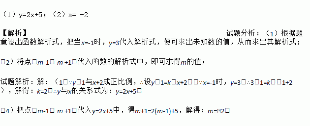 (1)y=2x+5;(2)m= -2 【解析】试题分析:(1)根据题意设出函数解析式,把当x=-1时,y=3代入解析式,便可求出未知数的值,从而求出其解析式; (2)将点(m-1, m +1)代入函数的解析式中,即可求得m的值; 试题解析:【解析】 (1)∵y-1与x+2成正比例,∴设y-1=k(x+2),∵x=-1时,y=3,∴3-1=k(-1+2),解得:k=2,∴y与x的...